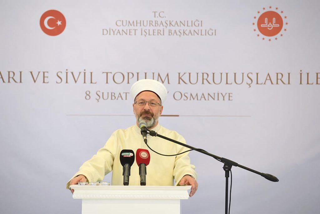 Burada yaptığı konuşmada, 6 Şubat depremlerinin üzerinden 2 yıl geçtiğini ancak hala yüreklerin yandığını belirten Başkan Erbaş, “Müslümanlığın güzelliği hem mutlu anlarında hem de zor anlarında mutluluklarını paylaştıkları gibi zorluklarını da, üzüntülerini de paylaşmak. Bu tür afetler bizim milletimizin çok önemli bir hasletini, zaman zaman unutulan bir hasletini o ilk günlerde ortaya çıkarıyor. İşte bu depremle milletimizin o hasletini, vasfını, güzelliğini hemen ilk gün ortaya çıkardı.” dedi.