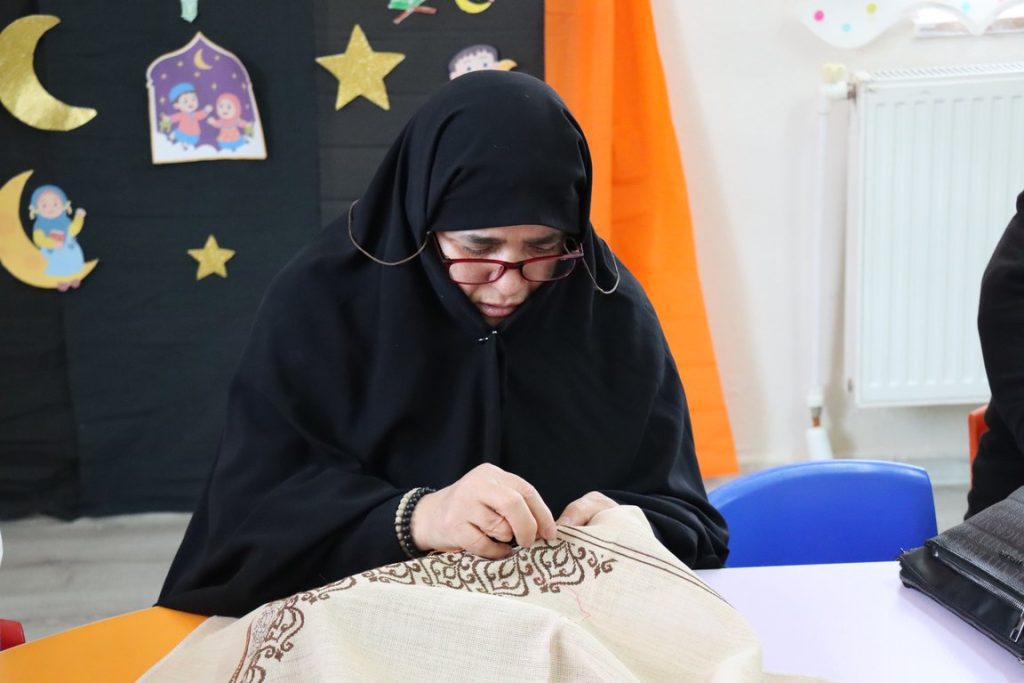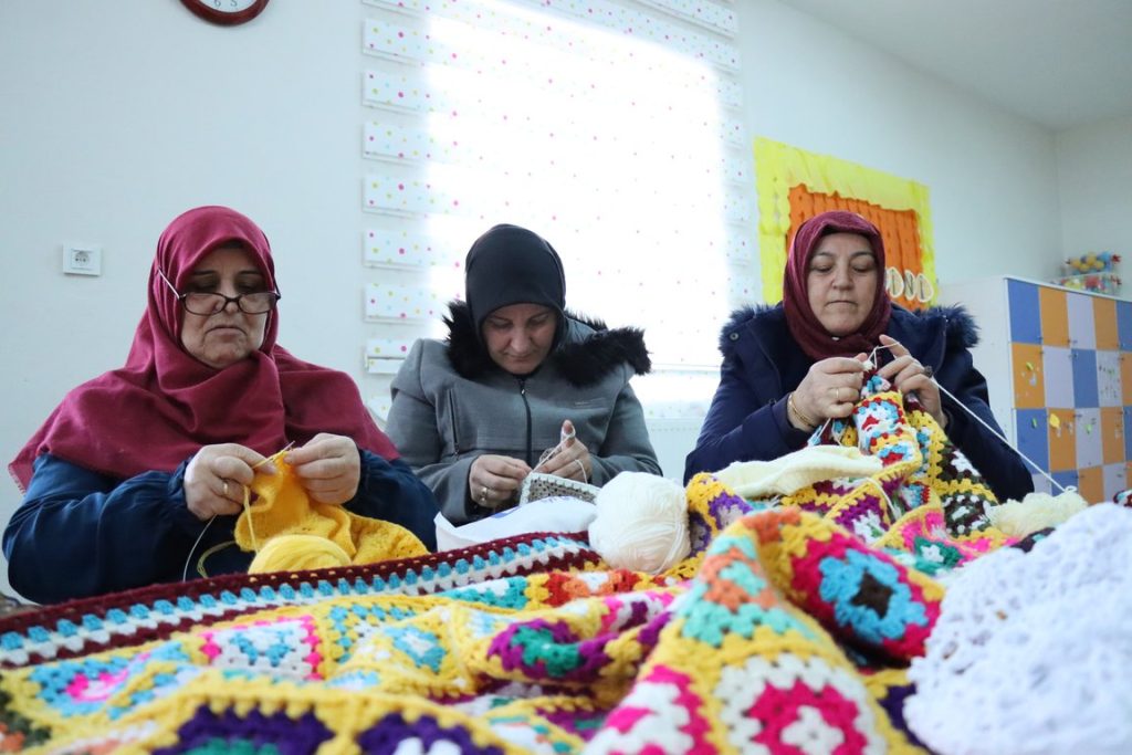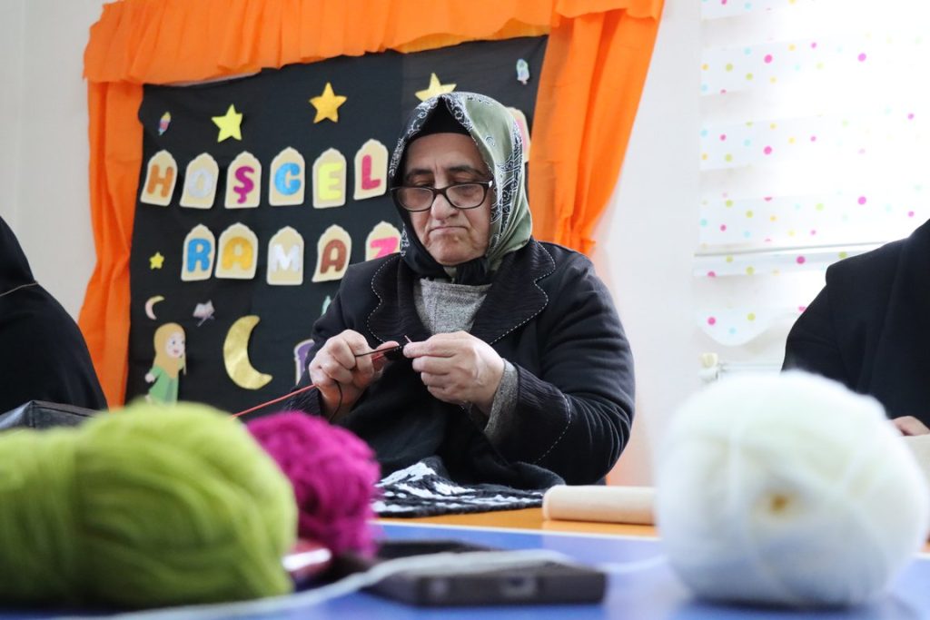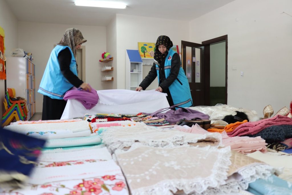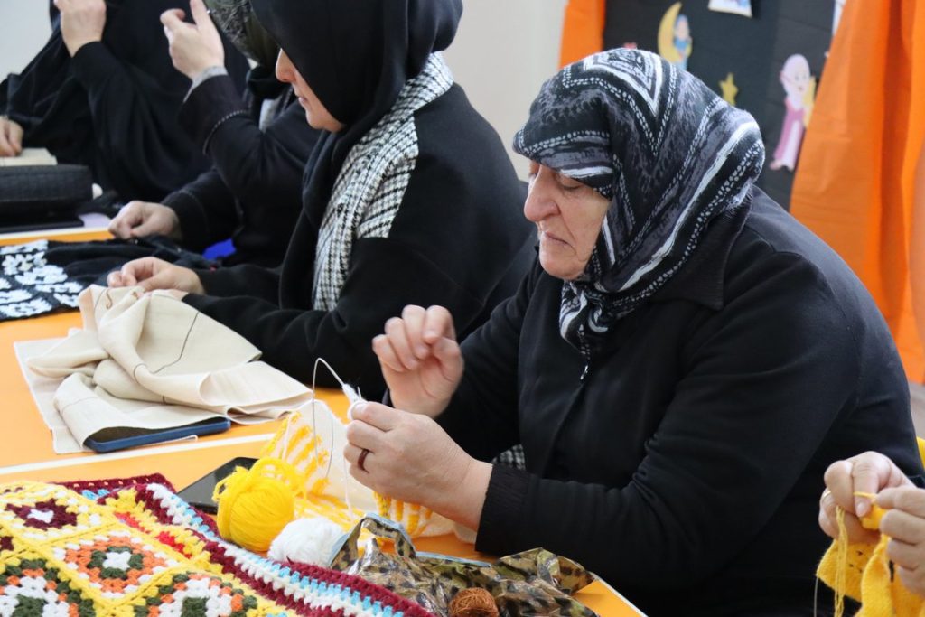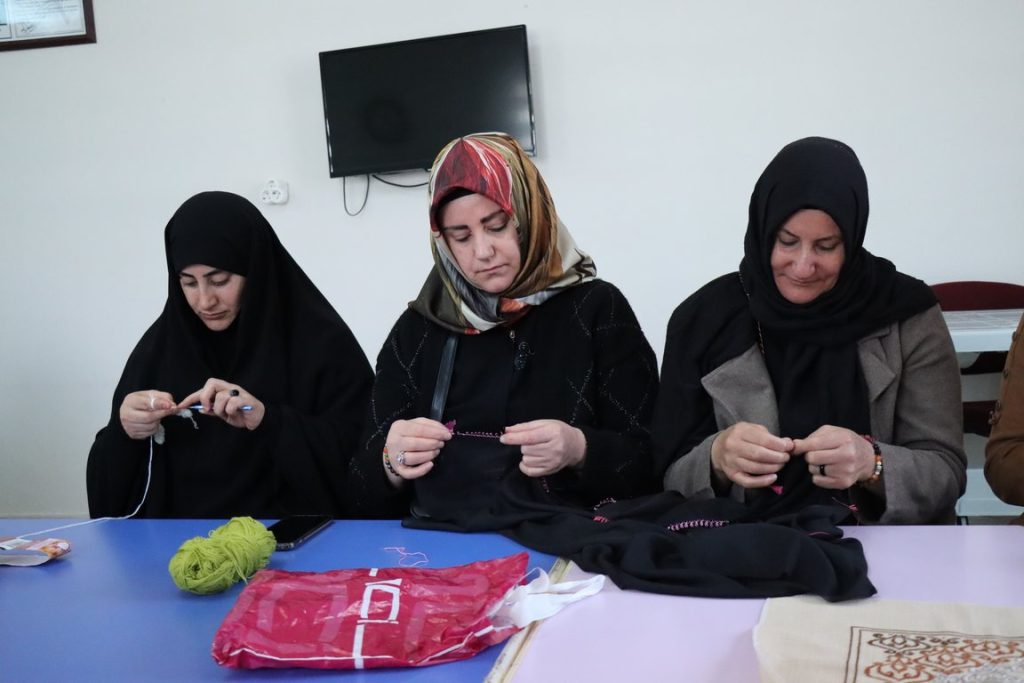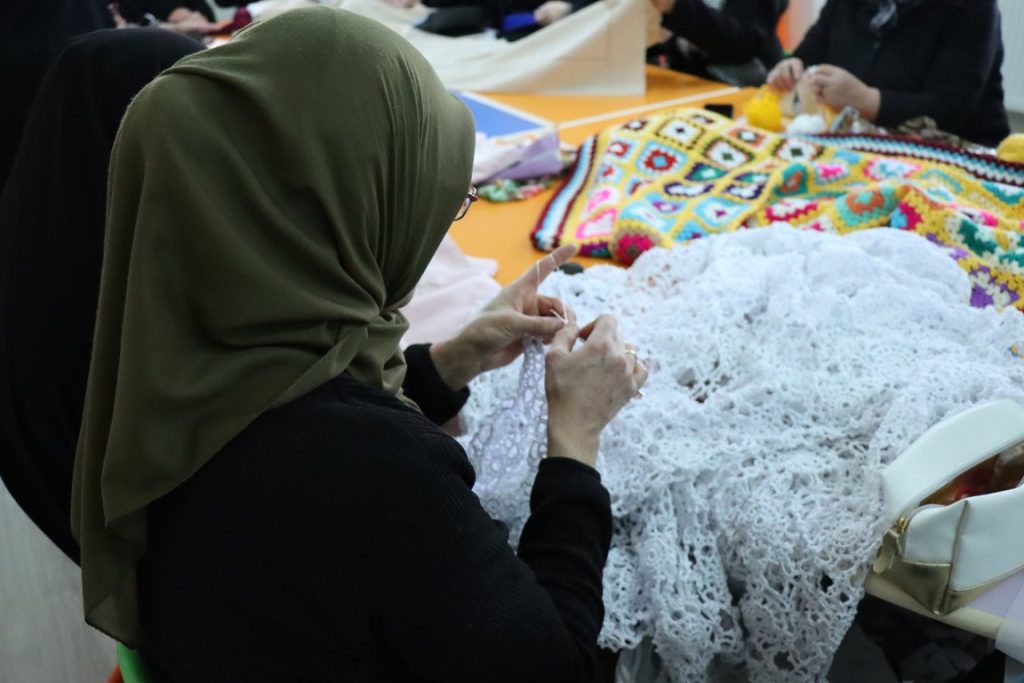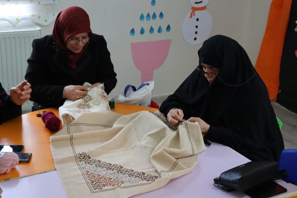 Kent merkezindeki Kur’an kurslarında toplanan gönüllü kadınlar, çeyiz setlerindeki ihtilaçlar doğrultusunda ilmek ilmek örgü ve dokuma yapıyor.