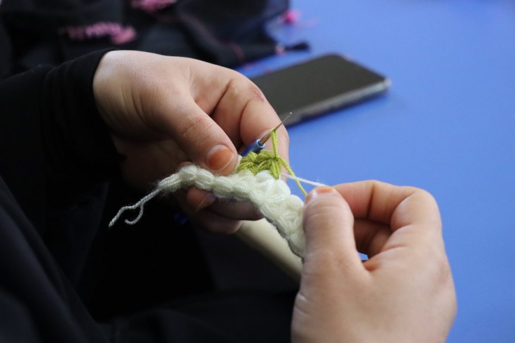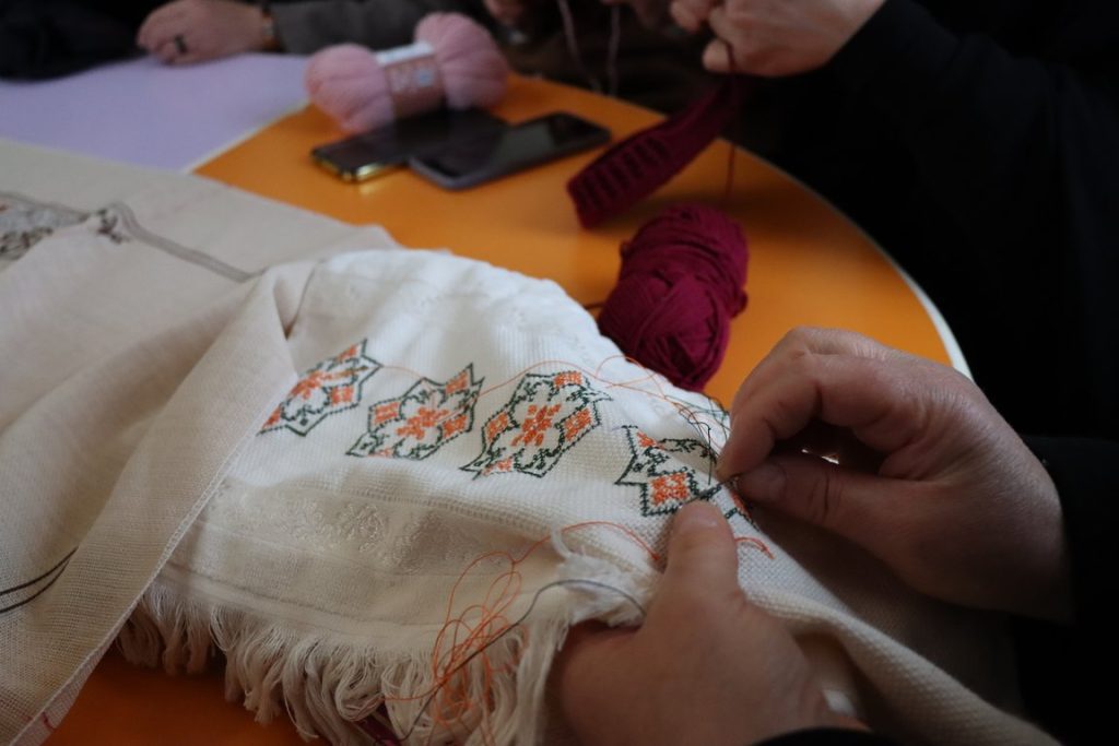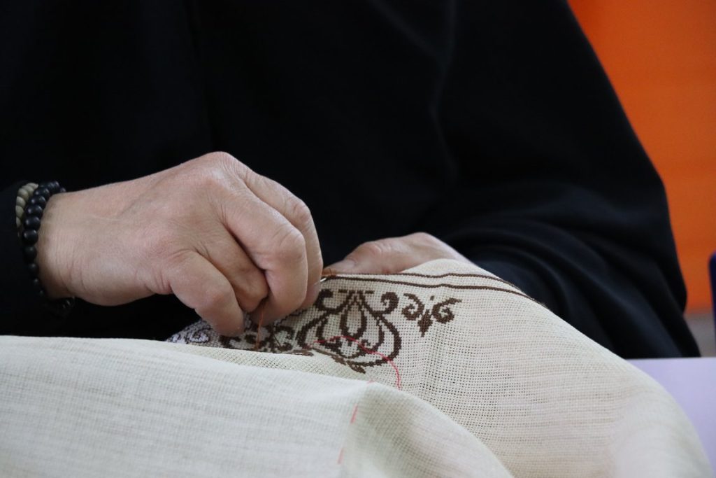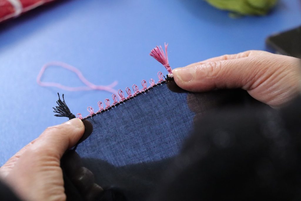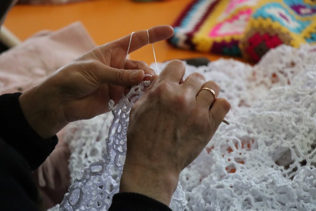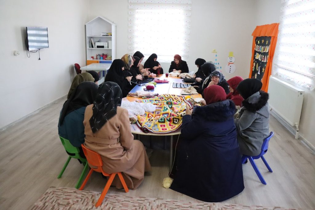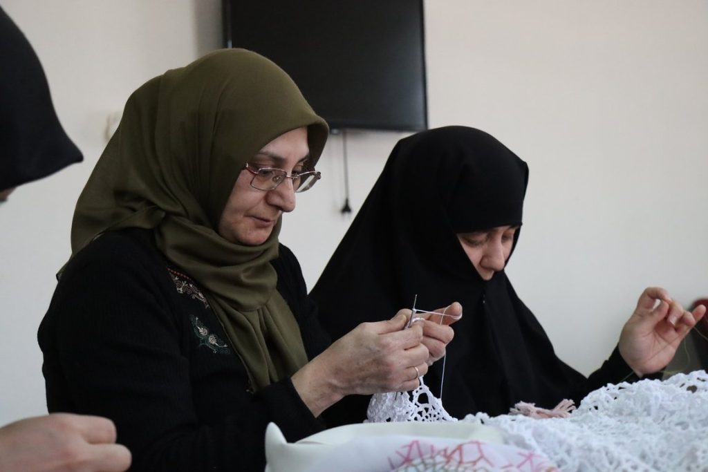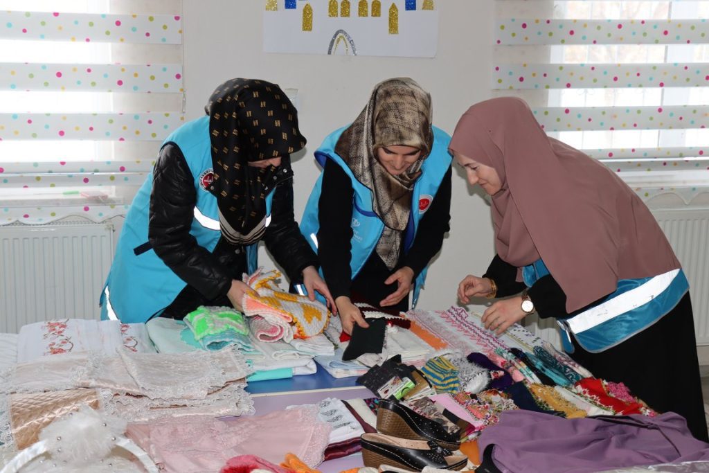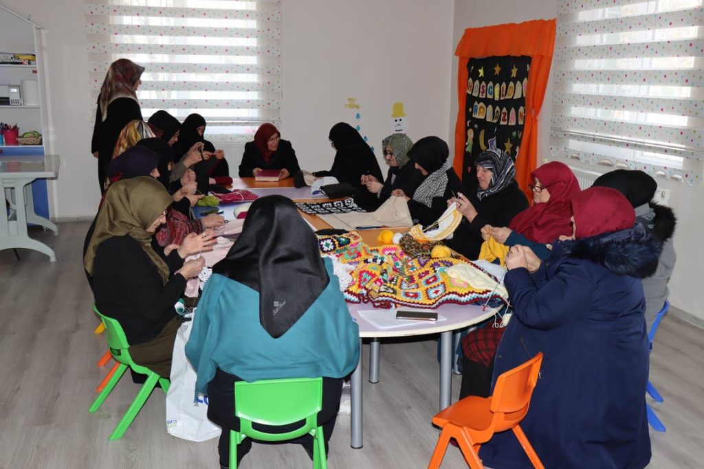 Kent merkezindeki Kur’an kurslarında toplanan gönüllü kadınlar, çeyiz setlerindeki ihtilaçlar doğrultusunda ilmek ilmek örgü ve dokuma yapıyor.