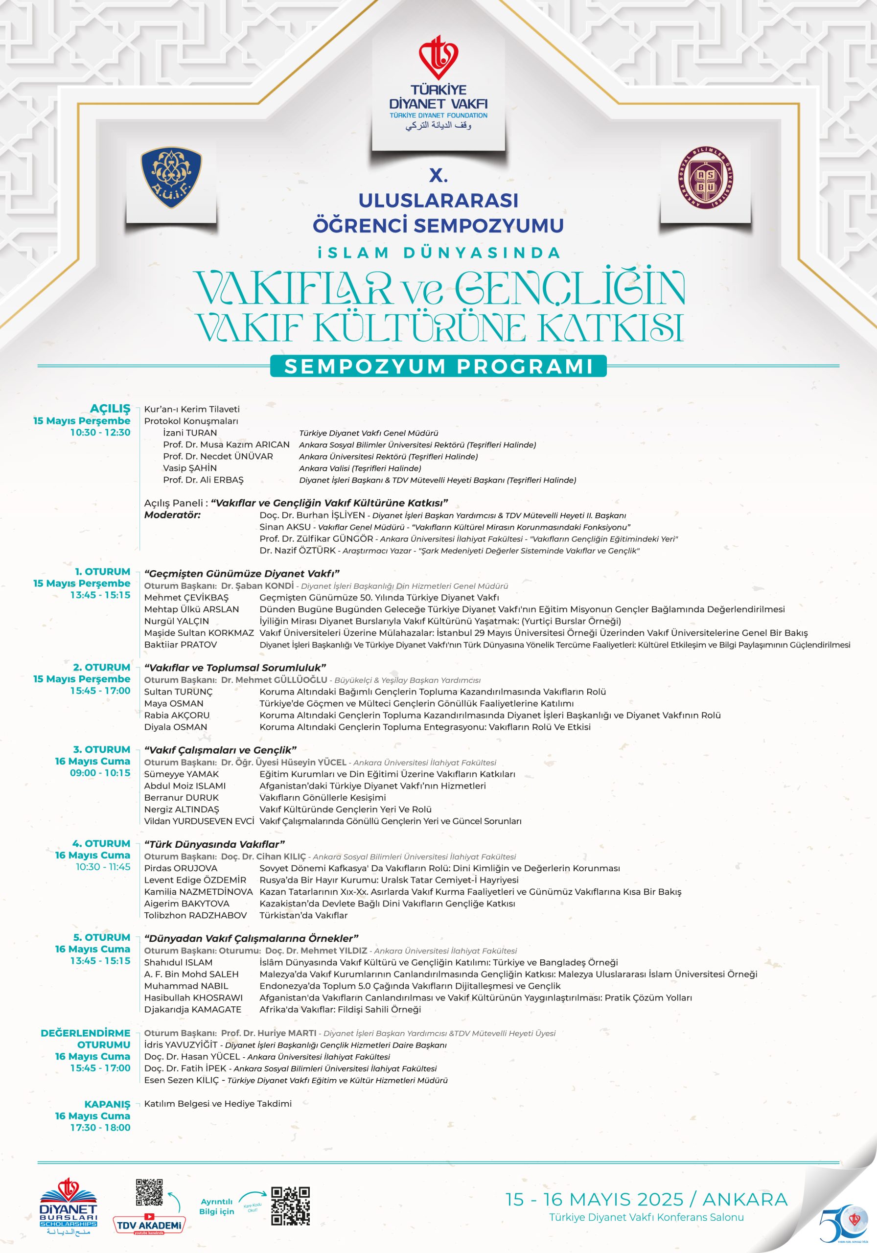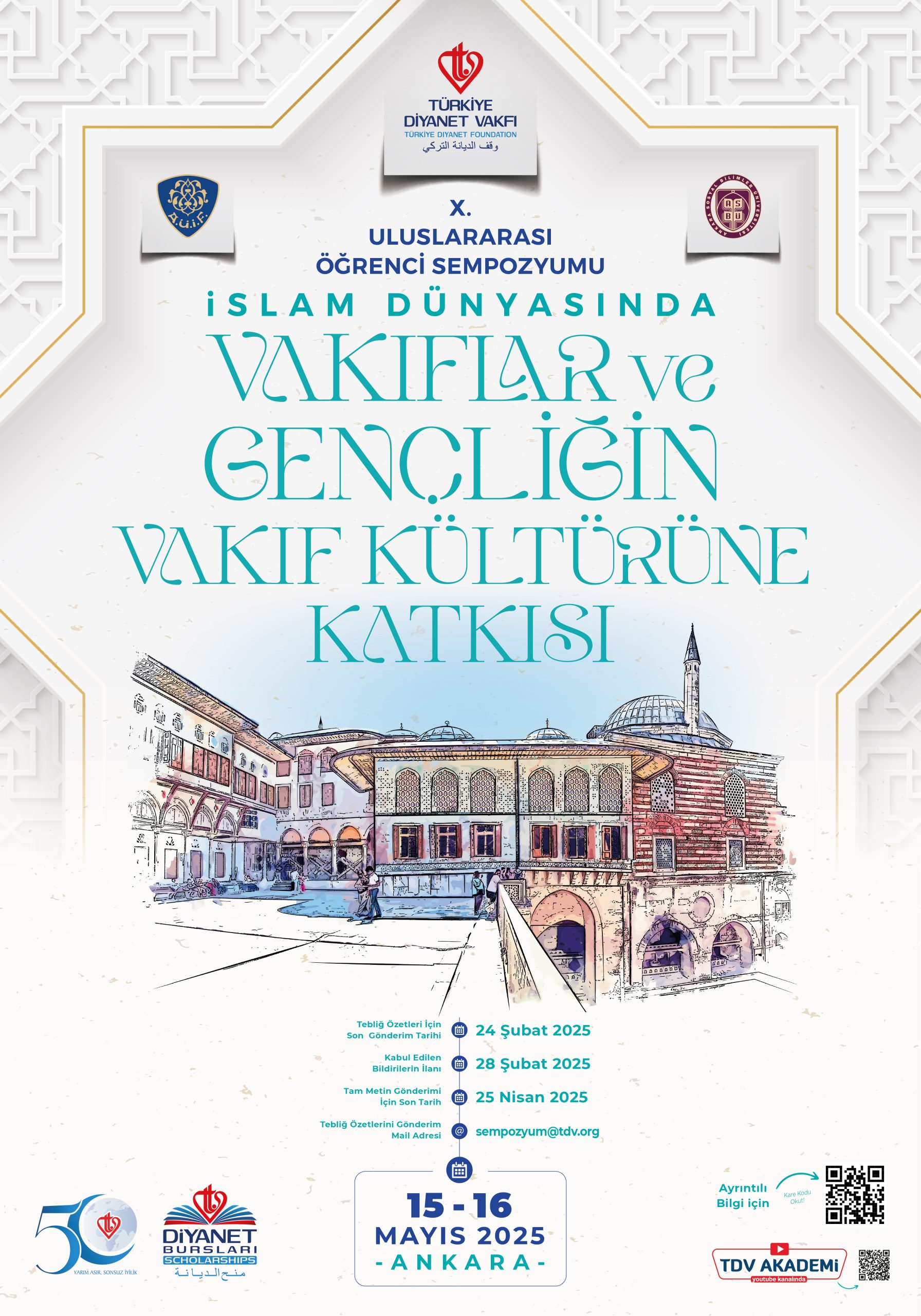 Vakfımızın 50. yıl kutlamaları kapsamında Ankara Üniversitesi İlahiyat Fakültesi ile Ankara Sosyal Bilimler Üniversitesi İlahiyat Fakültesi iş birliğinde düzenlenecek olan 10. Uluslararası Öğrenci Sempozyumu “İslam Dünyasında Vakıflar ve Gençliğin Vakıf Kültürüne Katkısı” temasıyla 15-16 Mayıs 2025 tarihlerinde Ankara’da gerçekleştirilecek.